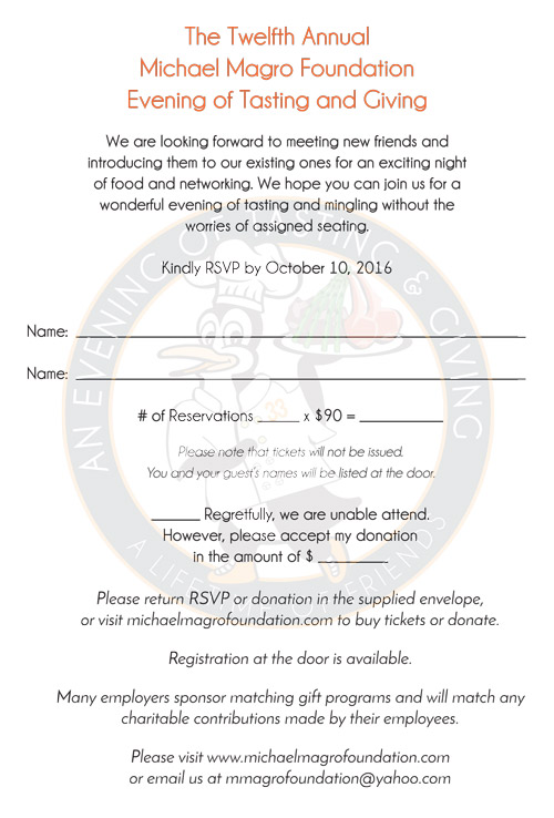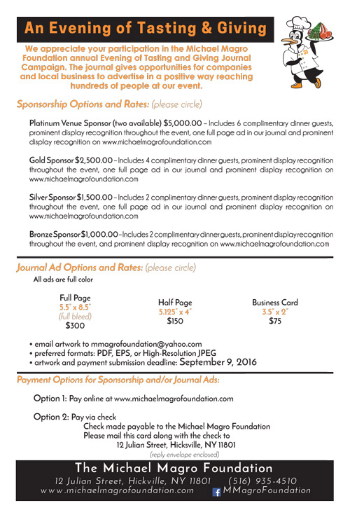 We welcome your participation in the Michael Magro Foundation 12th annual Evening of Tasting and Giving Journal Campaign. The journal gives opportunities for companies and local business to advertise in a positive way reaching 100’s of people at our event.
