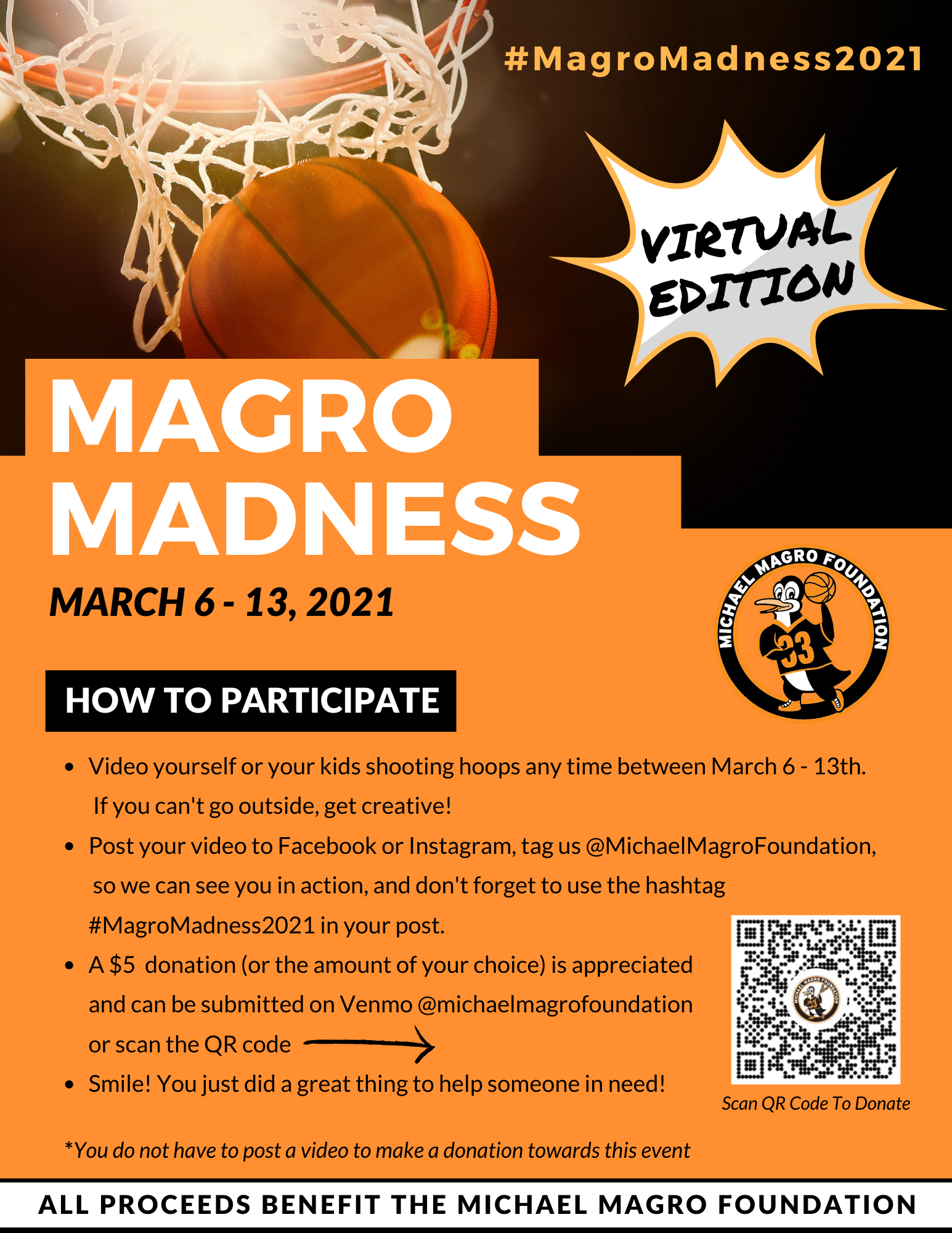 The Magro Madness committee is excited to announce that Magro Madness 2021 will be a virtual event held on Facebook and Instagram. This approach allows us all to stay safe while navigating our new normal but still contribute to an amazing mission.