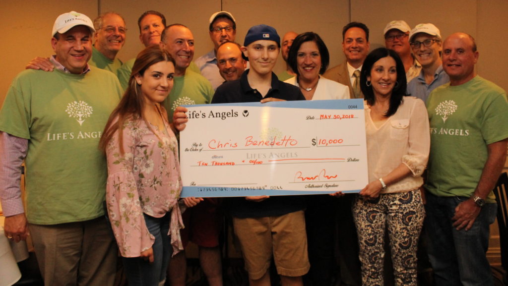 Chris Benedetto, center, poses with his family and the Life’s Angels board members during the check presentation ceremony at 388 Restaurant in Roslyn Heights. (Photo by Amelia Camurati)