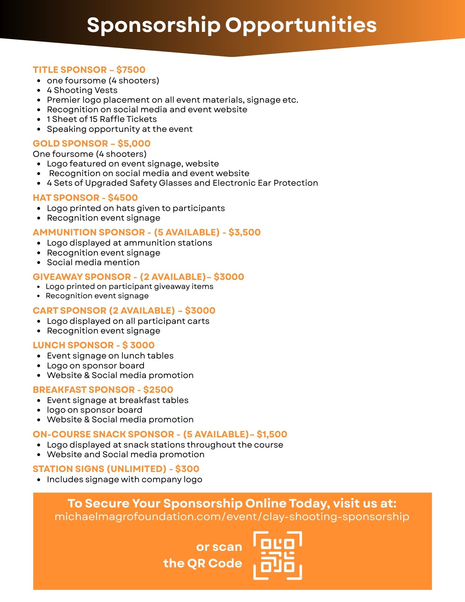 Select an option... Title Sponsor ($7,500.00) Gold Sponsor ($5,000.00) Hat Sponsor ($4,500.00) Ammunition Sponsor – (5 available) ($3,500.00) Giveaway Sponsor – (2 available) ($3,000.00) Cart Sponsor (2 available) ($3,000.00) Lunch Sponsor ($3,000.00) Breakfast Sponsor ($2,500.00) On-Course Snack Sponsor – (5 Available) ($1,500.00) Station Signs (Unlimited) ($300.00)